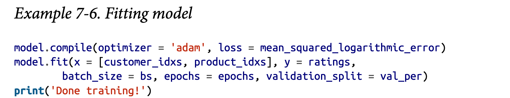 这是我们模型类的基础。它包括一个构造函数,其中包含一些代码,用于使用Keras API实例化协同过滤模型,以及一个“rate”函数,我们可以使用该函数通过我们的模型进行预测——即客户对特定产品的评分。