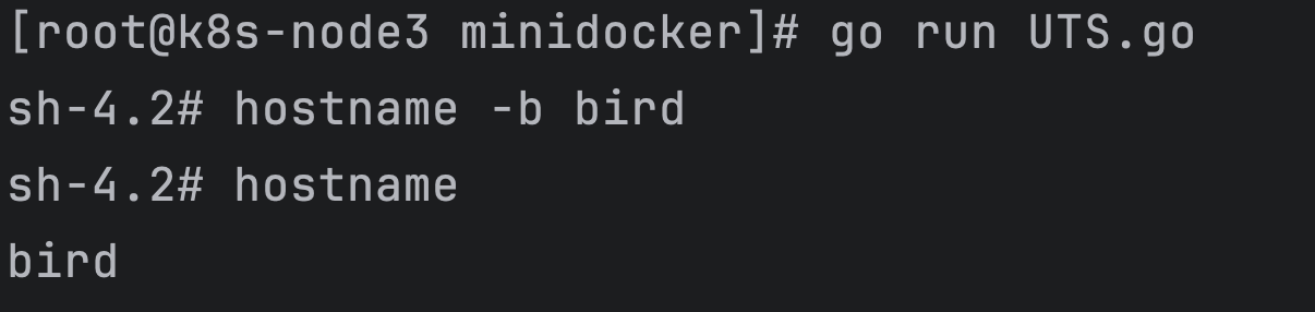 由于 UTS Namespace 对 hostname 做了隔离, 所以在这个环境内修改 hostname 应该不影响外部主机,下面来做一下实验。