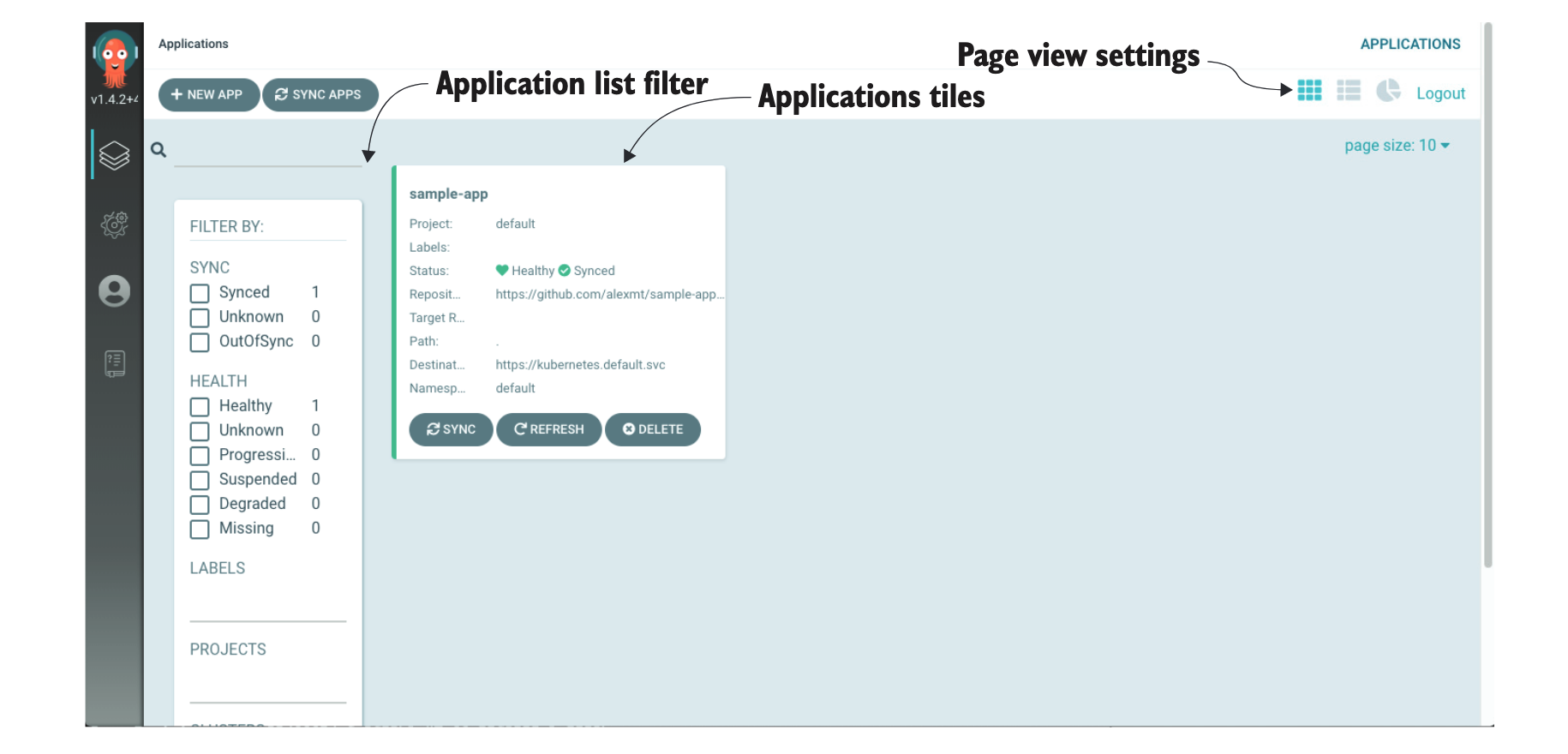 除了源和目标之外,Argo CD 应用程序还有两个更重要的属性:Sync status 和 health status。