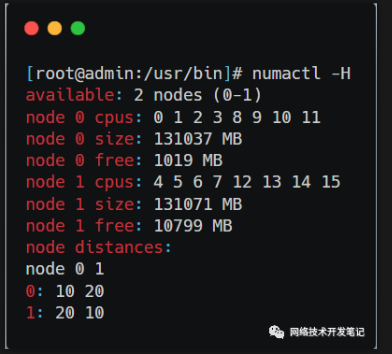 使用numactl -H命令可以看到NUMA下的内存分布: