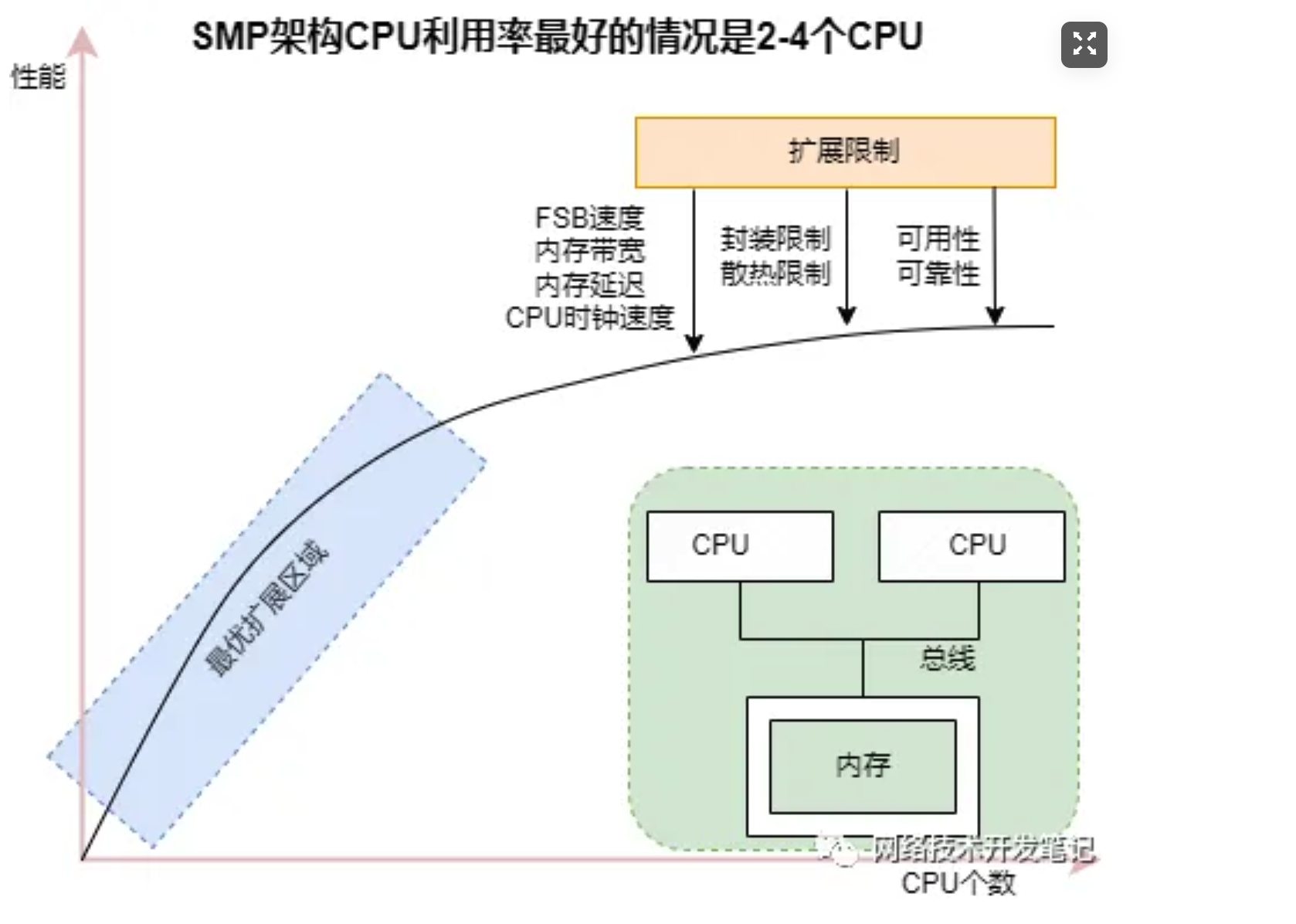 SMP架构在CPU核不多的情况下,问题不明显,有实验证明,SMP服务器CPU利用率最好的情况是2至4个CPU: